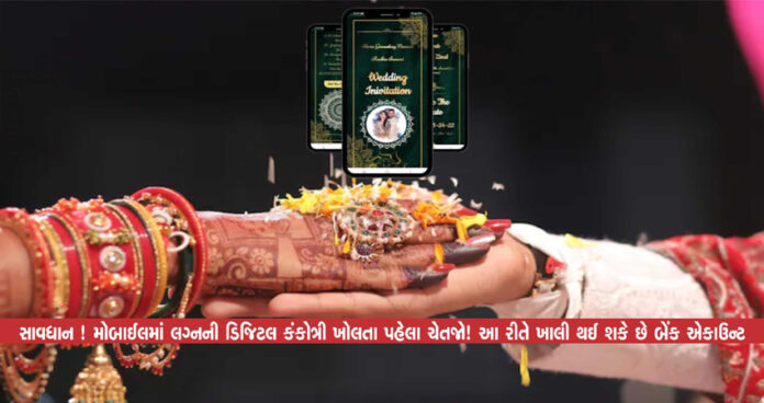 આજથી ધનારક શરૂ થઈ જશે પરંતુ આગામી સમય માટેની કંકોત્રીઓ આવવાની તો ચાલુ જ રહેશે.લોકો ડિજિટલ કંકોત્રી વોટ્સએપમાં મોકલીને આમંત્રણ પાઠવવાનો ક્રેઝ વધ્યો છે. આ ચલણને કારણે સાયબર ગઠિયાઓએ પણ નવી મોડેસ ઓપરેન્ડી બનાવી દીધી છે. વોટ્સએપથી ડિજિટલ કંકોત્રી મોકલીને તેમાં પહેલા પાનમાં આમંત્રણ હોય છે તે પેજ પર ક્લિક કરવામાં આવે કે ફોનમાં વાયરસ ઇન્સ્ટોલ થઈ જતો હોય છે. બાદમાં કોઈ અલગ જ નંબર પરથી કોલ આવવા લાગે છે અને તમારું બેંક બેલેન્સ ખાલી થઈ જાય છે.