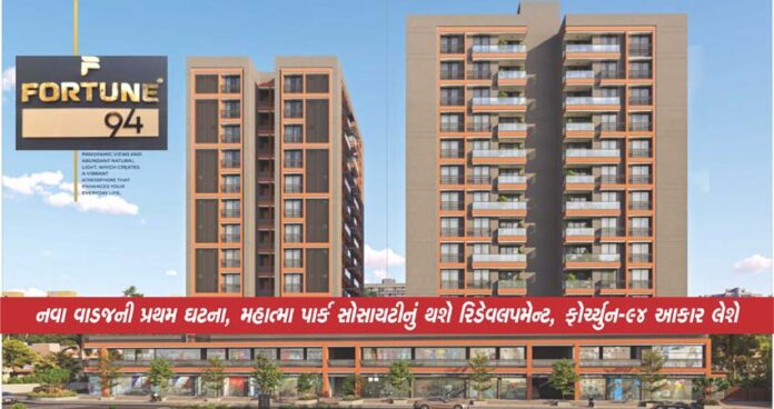 અમદાવાદ : અમદાવાદમાં અનેક સોસાયટીઓનું રિડેવલપમેન્ટ થઈ રહ્યું છે જેમાં જૂની સોસાયટીઓ પાડીને તેની જગ્યાએ નવી બિલ્ડિંગો બની રહી છે. તેમાં જૂની સોસાયટીના રહેવાસીઓને પણ ફાયદો છે કારણ કે તેમને નવું મકાન મળે છે, અને ડેવલપરને પણ ફાયદો થાય છે કારણ કે તે વધારે યુનિટ્સ ડેવલપ કરીને તેનું વેચાણ કરી શકે છે.ત્યારે શહેરના નવા વાડજ વિસ્તારમાં આવેલ સ્વામીનારાયણ મંદિર પાસે આવેલ મહાત્મા પાર્ક સોસાયટીમાં સભ્યો વચ્ચે સર્વસંમતિ સધાતા ટૂંક સમયમાં નવા નામ ફોર્ચ્યુન-94 સાથે રિડેવલપમેન્ટ સ્કીમનો પ્રારંભ થનાર છે.