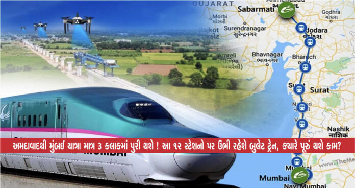 મુંબઈ અને અમદાવાદ વચ્ચે દોડતી બુલેટ ટ્રેન 12 સ્ટેશનો પર ઉભી રહેશે. આ યાદીમાં સાબરમતી, અમદાવાદ, આણંદ, વડોદરા, ભરૂચ, સુરત, બીલીમોરા,વાપી, બાયસર, વિરાર, થાણે અને મુંબઈના નામ સામેલ છે. હાલમાં અમદાવાદથી મુંબઈ જવામાં 7-8 કલાકનો સમય લાગે છે. બુલેટ ટ્રેન શરૂ થયા બાદ આ યાત્રા માત્ર 3 કલાકમાં પુરી કરી શકાશે.