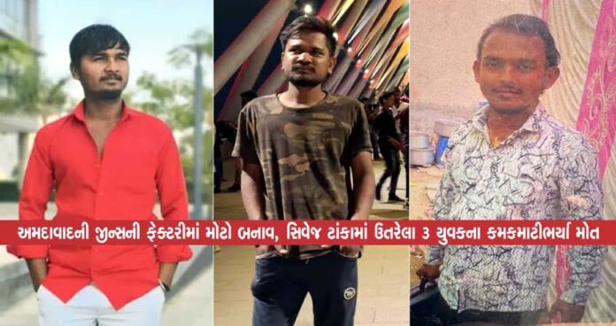 પ્રાપ્ત માહિતી અનુસાર, અમદાવાદના દાણીલીમડા ખોડિયાર નગરની જીન્સ બનાવતી કંપનીમાં ચોંકાવનારો બનાવ બન્યો હતો. કંપનીમા જિન્સના કાપડ ધોવાની ટાંકીમાં ઉતારેલ ત્રણ યુવક પૈકી સુનિલ રાઠવા, વિશાલ ઠાકોર, પ્રકાશ પરમારના કરુણ મોત નિપજ્યા છે. ત્રણે યુવકોના મૃતદેહ ટાંકી મા રાતભર અંદર રહ્યા હોવાની વાત પરિજનોઓ કરી રહ્યાં છે. ત્રણેય યુવકના પરિજનોને આ વિશેની જાણ થતા જ મણિનગરની એલજી હોસ્પિટલ દોડી આવ્યા હતા. પોલીસનો કાફલો પણ હોસ્પિટલ ખાતે પરિસ્થિતિનો તાગ મેળવી હોસ્પિટલમા ખડકાયો છે.ત્રણેય યુવકો 25 થી 30 વર્ષની વયના હોવાની પ્રાથમિક વિગતો જાણવા મળી છે. એમકે ક્રિએશન કંપનીના સંચાલક અને કંપનીના માલિક સામે ફરિયાદ કરવાની કાર્યવાહી શરૂ કરાઈ છે. બંનેને રાઉન્ડ અપ કરવામાં આવ્યા છે.