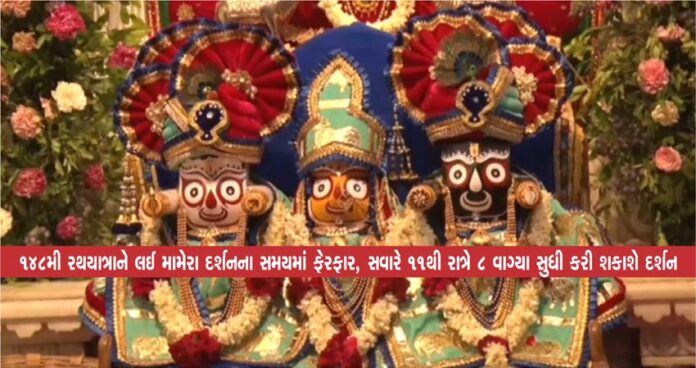 અમદાવાદ : 27મી જૂનના રોજ અમદાવાદમાં ભગવાન જગન્નાથની રથયાત્રા નીકળશે. ભગવાન જગન્નાથજીની 148મી રથયાત્રાની તૈયારીઓ જોરશોરથી ચાલી રહી છે. આ વર્ષે રથયાત્રાનો ઉત્સાહ વધુ ખાસ બની રહ્યો છે. કારણ કે આ વર્ષે ભગવાનના મામેરાના દર્શનનો સમય વધારી દેવામાં આવ્યો છે.ભક્તોની સુવિધા માટે મંદિર ટ્રસ્ટ દ્વારા ભગવાનના મોસાળમાં મામેરાના દર્શનનો સમય બદલવામાં આવ્યો છે.