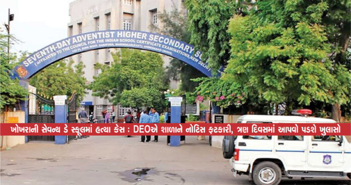 અમદાવાદ : અમદાવાદના ખોખરા વિસ્તારમાં આવેલી સેવન્થ ડે સ્કૂલમાં એક વિદ્યાર્થીની છરીના ઘા ઝીંકી હત્યા કરવામાં આવી હોવાની ઘટનાએ સમગ્ર રાજ્યમાં હલચલ મચાવી છે.આ ગંભીર ઘટનાને પગલે જિલ્લા શિક્ષણ અધિકારી (DEO) રોહિત ચૌધરીએ સ્કૂલને નોટિસ ફટકારીને ત્રણ દિવસમાં ખુલાસો માગ્યો છે. આ ઘટનાએ શાળાની સલામતી અને વહીવટી વ્યવસ્થા પર ગંભીર સવાલો ઉભા કર્યા છે.