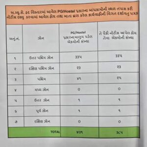 પ્રાપ્ત રિપોર્ટ મુજબ, અમદાવાદમાં રહેણાંક બિલ્ડિંગોમાં પેંઇંગ ગેસ્ટ(PG) ચાલતા હોવાનું સામે આવ્યું છે. જેથી દરેક ઝોનમાં તપાસ કરવામાં આવી હતી. જેમાં શહેરમાં કુલ 401 જેટલા PG ચલાવવામાં આવી રહ્યા હોવાની વિગતો સામે આવી છે. ગુજરાત હાઇકોર્ટ દ્વારા ગાઈડલાઈન આપવામાં આવી છે. PG ચલાવવા માટે સોસાયટી- ફ્લેટની NOC અને પોલીસ વેરિફિકેશન લેવાનું હોય છે. મ્યુનિસિપલ કોર્પોરેશન દ્વારા આવા નિયમોનું પાલન ન કરનાર 385 જેટલા PGને નોટિસ આપવામાં આવી છે.
