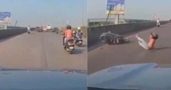 મળતી વિગતો અનુસાર, એક વીડિયો સોશિયલ મીડિયા પર ખૂબ જ વાયરલ થઈ રહ્યો છે. જેમાં ઓવરબ્રિજ પરથી મોપેડ લઈને પસાર થઈ રહેલો યુવાન એકદમ બેદરકારી દાખવીને વાહન ચલાવી રહ્યો છે. તે ઓવરબ્રિજ પસાર કરતી વખતે મોબાઈલનો ઉપયોગ કરી રહ્યો છે અને આ દરમિયાન જ તે મોપેડ પરથી કાબૂ ગુમાવી દે છે અને ઊંધેકાંધ નીચે પટકાય છે.