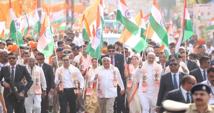 પ્રાપ્ત રિપોર્ટ મુજબ, આજે 17મી નવેમ્બરે મુખ્યમંત્રી ભુપેન્દ્ર પટેલના ઘાટલોડીયા વિધાનસભા વિસ્તારમાં યુનિટી માર્ચનું આયોજન કરવામાં આવ્યું હતું. આંબલી ગામ ખાતે આવેલા ખોડીયાર મંદિર ખાતેથી આ યુનિટી માર્ચ પદયાત્રાનો પ્રારંભ કરીને પદયાત્રામાં જોડાયા હતાં.‘એક ભારત, આત્મનિર્ભર ભારત’ના સંદેશને વધુ મજબૂત કરવાના હેતુથી આ યુનિટી માર્ચનું આયોજન કરવામાં આવ્યું હતું. મુખ્ય પ્રધાન ભૂપેન્દ્ર પટેલે ઘાટલોડીયા વિધાનસભામાં આવતા આંબલી વિસ્તારના ખોડીયાર માતાના મંદિર ખાતેથી આ યુનિટી માર્ચનો શુભારંભ કરાવ્યો હતો.