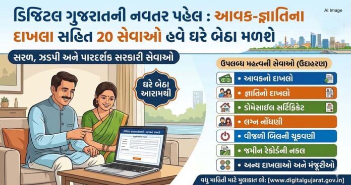 ડિજિટલ ગુજરાત અંતર્ગત આ પાંચ વિભાગોની 20 નાગરીકલક્ષી સેવાઓની સૌથી વધુ અરજીઓ આવે છે. આ સેવાઓને ઓનલાઇન કરવાથી નાગરિકોના ડેટાની એકવાર એન્ટ્રી કર્યા બાદ તેને વિવિધ સેવાઓનાં પુન: ઉપયોગ કરી શકાશે. આ ઉપરાંત બિનજરૂરી દસ્તાવેજોની માંગણી નાબૂદ કરી અરજી ફોર્મને અત્યંત સરળ બનાવવામાં આવ્યા છે. વધુમાં દસ્તાવેજોનું ડિજિટલ વેરિફિકેશન કરવામાં આવશે. આધારકાર્ડ આધારિત ઓળખ, API દ્વારા ઓનલાઈન રેકોર્ડ ચકાસણી અને DigiLocker ઇન્ટિગ્રેશન કરવામાં આવશે. મહત્વની વાત એ છે કે, આ 20 સેવાઓનો લાભ મેળવવા માટે eSign સુવિધા, WhatsApp દ્વારા સેવા વિતરણ, QR કોડ ધરાવતા પ્રમાણપત્રો અને UPI દ્વારા ઓનલાઈન પેમેન્ટ જેવી વ્યવસ્થા કરવામાં આવી છે.