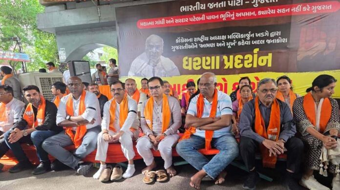 પ્રાપ્ત રિપોર્ટ મુજબ, અમદાવાદ શહેર ભાજપ દ્વારા યોજાયેલ ધરણા પ્રદર્શનમાં ભાજપના કાર્યકર્તાઓ અને નેતાઓએ ખડગેના નિવેદનને ગુજરાતની અસ્મિતાનું અપમાન ગણાવ્યું હતું. વિરોધ પ્રદર્શન દરમિયાન ભાજપના કાર્યકર્તાઓ પોતાના હાથ પર કાળી પટ્ટી બાંધીને આવ્યા હતા. આશ્ચર્યજનક રીતે, આક્રમક સૂત્રોચ્ચારને બદલે કાર્યકર્તાઓએ મૌન ધારણ કરીને પોતાનો વિરોધ નોંધાવ્યો હતો, જે ખડગેના નિવેદન સામે એક ગંભીર સંદેશ આપવાનો પ્રયાસ હતો.