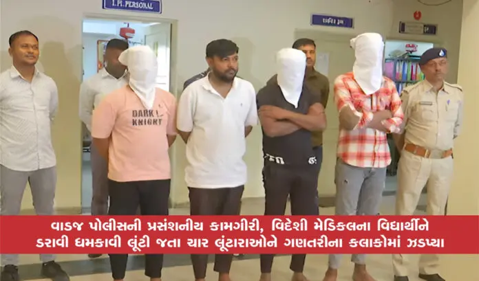 અમદાવાદ: ફિલિપાઈન્સમાં MBBS નો અભ્યાસ કરતો વિદ્યાર્થી મુલચંદ ડાકા નામનો યુવક 13 ફેબુઆરીએ ભારત આવ્યો હતો. મૂળ રાજસ્થાનનો આ યુવક પોતાના ફિલિપાઈન્સના મિત્ર ફિરોજના ભાઈ નવાબનું પાર્સલ લેવા રાજસ્થાનથી અમદાવાદ આવ્યો હતો. ત્યારે વાડજ ખાતે આ લૂંટારાઓએ યુવકને પાર્સલ લેવા આવ્યો છે, તેવું કહીને મારવાની ધમકી આપીને તેની પાસેથી પાસપોર્ટ, મોબાઈલ અને ATM કાર્ડની લૂંટ કરી હતી.વાડજ પોલીસે ગણતરીના કલાકોમાં લૂંટનો ભેદ ઉકેલી નાખ્યો અને આ કેસમાં સંડોવાયેલા ચારેય આરોપીની ધરપકડ કરી છે.