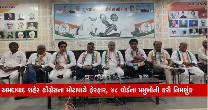 અમદાવાદ શહેર કોંગ્રેસના માળખામાં ફેરફાર કરવામાં આવ્યા છે. શહેર પ્રમુખ દ્વારા આગેવાનો સાથે ચર્ચા કરીને શહેરના 48 વોર્ડમાંથી 40 વોર્ડમાં બે-બે વોર્ડ પ્રમુખની નિમણૂક કરવામાં આવી છે. જેમાંથી 28 વોર્ડ પ્રમુખને રિપીટ કરવામાં આવ્યા છે. જ્યારે અન્યને શહેરમાં અન્ય હોદ્દા આપવામાં આવ્યા છે. આવનારી ચૂંટણીમાં માઈક્રો લેવલે અસરકારક કામગીરી થઈ શકે તે માટે શહેરના સંગઠનમાં મોટાપાયે ફેરફાર કરવામાં આવ્યો છે.