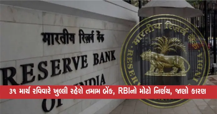 RBIએ કહ્યું કે 31 માર્ચે નાણાકીય વર્ષના વાર્ષિક ક્લોઝિંગ દરમિયાન દેશભરની બેન્કો નક્કી સમય પર ખોલવાનો નિર્દેશ આપવામાં આવ્યો છે. એટલે કે 31 માર્ચ રવિવારે દરેક બેન્કો પોતાના નિયમિત સમય પર ખુલશે અને નક્કી સમય પર બંધ થશે. પરંતુ ગ્રાહક NEFT અને RTGS ટ્રાન્ઝેક્શન રાત્રે 12 કલાક સુધી કરી શકશે.