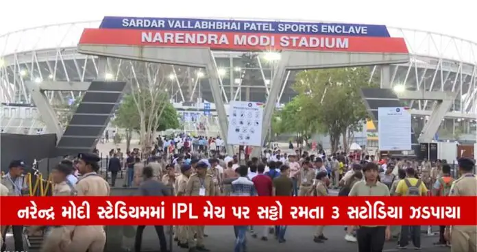 પ્રાપ્ત રિપોર્ટ મુજબ અમદાવાદ એલસીબીના કર્મચારીઓ નરેન્દ્ર મોદી સ્ટેડિયમની અંદર બંદોબસ્તમાં હતા. આ દરમિયાન તેમને બાતમી મળી હતી કે, પ્રેસિડેન્ટ ગેલેરીમાં બેઠેલો એક શખ્સ મોબાઈલમાં માસ્ટર આઈડી રાખીને લાઈવ મેચ પર સટ્ટો રમાડી રહ્યો છે. પોલીસે બાતમીને આધારે તે શખ્સ પાસે જઈને તેની પૂછપરછ કરી હતી. આ દરમિયાન તેણે પોતાનું નામ દીપક મોહનાની જણાવ્યું હતું. તેની પાસેથી 12 હજાર રોકડા અને મેચની એક ટિકિટ મળી આવી હતી. તેના મોબાઈલમાં સટ્ટા માટેના વિવિધ આઈડી મળી આવ્યાં હતાં.જેને આધારે પોલીસે તપાસ હાથ ધરીને સ્ટેડિયમમાં સટ્ટો રમતા ત્રણ સટોડિયાને રંગેહાથ પકડ્યા હતા.