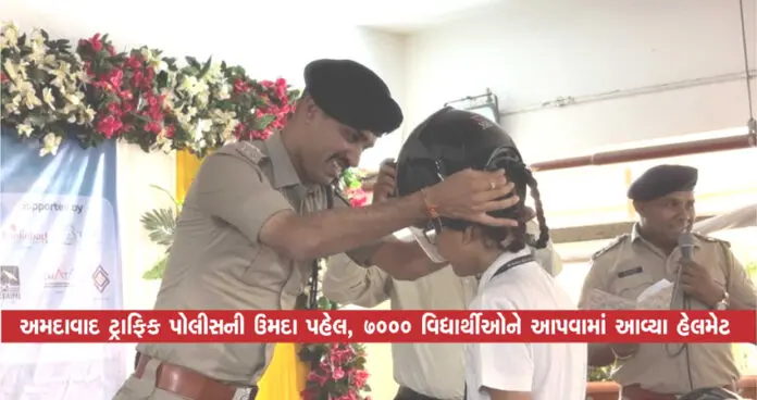 અમદાવાદ : અમદાવાદમાં અકસ્માતનું પ્રમાણ વધતા બાળકોની સુરક્ષા અને હેલ્મેટને લઈને જાગૃત કરવા શહેરની ટ્રાફિક પોલીસે મિશન હેલ્મેટ સંસ્કાર પ્રોજેક્ટ અંતર્ગત એક ઉમદા પહેલ શરૂ કરી છે. હેલ્મેટ પ્રત્યે બાળકો થકી વાલીઓને જાગૃત કરવા માટેનું એક અભિયાન પોલીસે શરૂ કર્યુ છે. આ પ્રોજેક્ટ અંતર્ગત પોલીસે 7 હજાર બાળકોને હેલ્મેટનું વિતરણ કર્યુ હતુ અને વાલીઓમાં પણ હેલ્મેટ પ્રત્યે જાગૃતિ લાવવાનો પ્રયાસ કર્યો હતો.પોલીસે વાહન ચાલકોને હેલ્મેટ પહેરવાની અપીલ કરી છે.