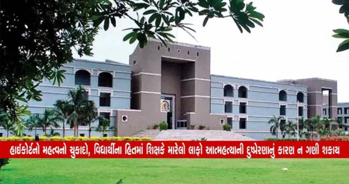 અમદાવાદ : ગુજરાત હાઈકોર્ટે શિક્ષકોના હિતમાં મહત્વનો ચુકાદો આપ્યો હતો.ગુજરાત હાઇકોર્ટે પોતાના ચુકાદામાં કહ્યું હતું કે વિદ્યાર્થીના હિતમાં કાર્યવાહી આત્મહત્યા દુષ્પ્રેરણાનું કારણ નથી. કોર્ટે કહ્યું હતું કે વિદ્યાર્થીના હિતમાં શિક્ષક આકરા પગલા લેતા હોય છે. શિક્ષક માટે વિદ્યાર્થીનું હિત ઘણું મહત્વનું છે. ગુજરાત હાઇકોર્ટે વર્ષ 2016ના કેસમાં ચુકાદો આપ્યો હતો. કોર્ટે કહ્યું હતું કે સંવેદના પરિવાર સાથે પણ નિર્દોષને સજા વ્યાજબી નથી.