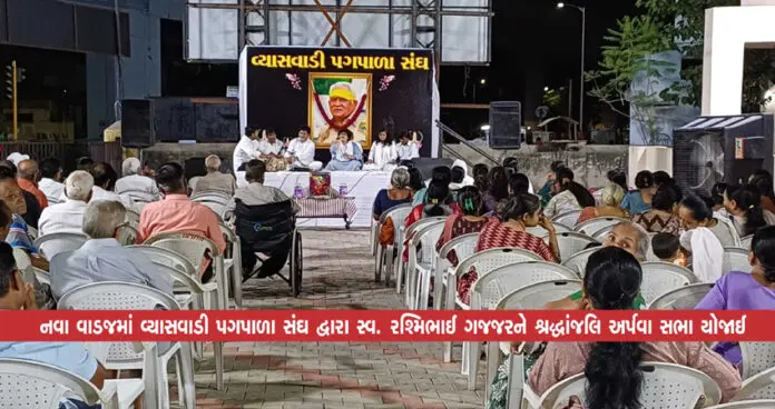 અમદાવાદ : વ્યાસવાડી પગપાળા સંઘ દ્વારા નવા વાડજ વિસ્તારમાં રોનક પાર્કમાં રહેતા સ્વર્ગસ્થ રશ્મિભાઈ ભીખાભાઈ ગજ્જરની શ્રદ્ધાંજલિ સભા યોજાઈ હતી.વ્યાસવાડી પગપાળા સંઘના સાચા સેવક અને પદયાત્રી ને શ્રદ્ધાસુમન અર્પણ કરી સંઘ સાથેનો તેમનો નાતો યાદ કરવામાં આવ્યો હતો. નવા વાડજમાં મધુકર સોસાયટીના કોમન પ્લોટમાં યોજાયેલી શ્રદ્ધાંજલિ સભામાં રશ્મિભાઈના પરિવારજનો અને વ્યાસવાડી પગપાળા સંઘના આગેવાનો, પદયાત્રીઓ તથા મોટી સંખ્યામાં સ્થાનિકો ઉપસ્થિત રહી રશ્મિભાઈને પુષ્પાંજલિ અર્પણ કરી હતી.