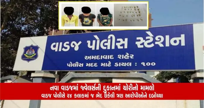 ઘટનાની વિગત જાણીએ તો શહેરના નવા વાડજ શાકમાર્કેટમાં આવેલા આભૂષણ જ્વેલર્સમાં ગત 4 મેના રોજ નોંધાયેલ ફરિયાદમાં ગ્રાહકના સ્વાંગમાં એક મહિલા અને બે પુરુષો જવેલર્સની દુકાનમાં આવી વેપારીની નજર ચૂકવી ચોરીની ઘટનાને અંજામ આપ્યો હતો. પોલીસે ફરિયાદને આધારે ચોર ગેંગના ત્રણ આરોપીઓ પ્રવીણ ઉર્ફે અરવિંદ દંતાણી, કરણ ઉર્ફે કાલુ દંતાણી તેમજ ભારતીબેન દંતાણીની ચોરાયેલ મુદ્દામાલ સાથે ધરપકડ કરી છે.ત્રણેય આરોપીઓ એકબીજાના પરિચિત છે. ત્રણેય આરોપીઓએ છકડો રીક્ષા ભાડે કરી જ્વેલરી ખરીદવાના બહાને તે દુકાનમાં પહોંચ્યા હતા અને ત્યારબાદ ચોરીને અંજામ આપ્યો હતો.