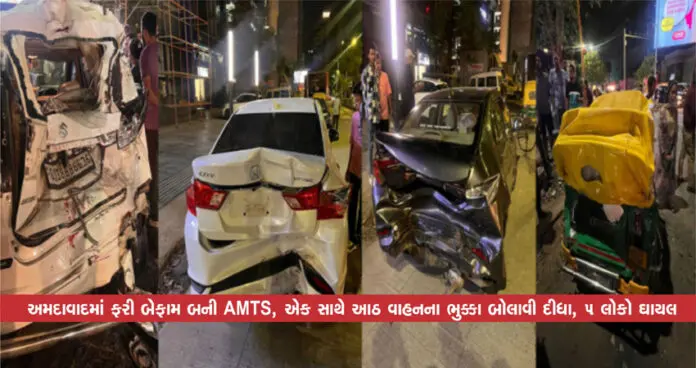 અમદાવાદ : અમદાવાદમાં AMTS બસે વધુ એક અકસ્માત સર્જ્યો છે. શહેરના જોધપુર ચાર રસ્તા પર AMTS બસ ચાલકે ટક્કર મારતા 8 જેટલા વાહનો એકબીજા સાથે અથડાયા હતા. એક સાથે આઠ વાહનો એકબીજા સાથે અથડાતા વાહનોને ભારે નુકશાન થયું છે, જયારે આ અકસ્માતમાં ચારથી પાંચ લોકોને ઈજાઓ પહોંચી છે. AMTS બસની ટક્કરથી આ અકસ્માત સર્જાયો હતો.આ બનાવની જાણ થતાં ટ્રાફિક પોલીસ ઘટના સ્થળે પહોંચી તપાસ હાથ ધરી છે.