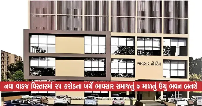 અમદાવાદ : અમદાવાદના નવા વાડજ વિસ્તારમાં 132 ફૂટ રીંગ રોડ પર 25 કરોડના ખર્ચે 7 માળનું ઉંચુ ભાવસાર સમાજના સૌથી મોટા ભવનનું નિર્માણ થવા જઈ રહ્યું છે. આ ભવનને તૈયાર કરવામાં માટે દોઢ વર્ષ જેટલો સમય લાગશે.છેલ્લા એક વર્ષમાં સમાજના અગ્રણીઓ પાસેથી 5 કરોડનું દાન એકત્રિત કરવામાં આવ્યું છે.