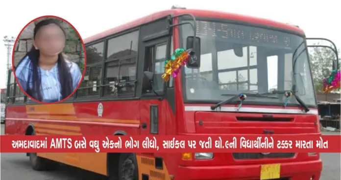 પ્રાપ્ત રિપોર્ટ મુજબ, અમદાવાદના રામબાગની જીવકોરબા સ્કૂલમાં ધોરણ નવમાં અભ્યાસ કરતી 14 વર્ષની વિદ્યાર્થિની ટ્યુશનમાં સાઈકલ લઈને જઈ રહ્યી હતી. તે સમયે મણિનગરના જવાહર ચોક ભૈરવનાથ માર્ગ પર પૂરપાટ ઝડપે જતી AMTSની બસે તેને અડફેટે લીધી હતી. જેમાં બસનું આગલું ટાયર તેના પર ફરી વળતા ઘટનાસ્થળે જ તેનું કમકમાટી ભર્યું મોત નીપજ્યું હતું.