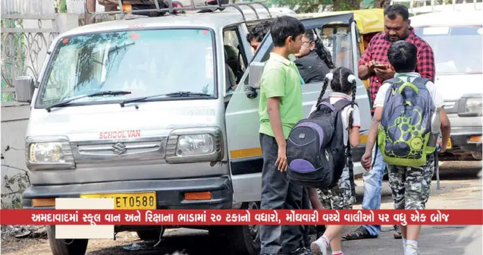 અમદાવાદ : અમદાવાદ: ઉનાળુ વેકેશન પૂરું થવામાં છે. આગામી 13 જૂનથી શાળાઓ શરૂ થઈ રહી છે તે પહેલાં જ વાલીઓ પર વધુ એક મોંઘવારીનો માર સહન કરવાનો વારો આવ્યો છે. વાલીઓને સ્કુલ વાહનોમાં ભાડા વધારો કરવામાં આવ્યો છે. સ્કૂલ શરૂ થતાં જ સ્કૂલ વાન અને રિક્ષાના 20 ટકા જેટલા ભાડા વધારે ચૂકવવા વાલીઓએ તૈયાર રહેવું પડશે.
