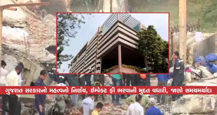 રાજ્યમાં બિનઅધિકૃત ગેરકાયદેસર બાંધકામો ફી ભરીને કાયદેસર કરવા માટેની ઇમ્પેક્ટ ફી ભરવાની મુદત વધુ 6 મહિના લંબાવાઇ છે. ઈમ્પેક્ટ ફી ભરવાની મુદતમાં સતત ચોથી વખત વધારો કરવામાં આવ્યો છે. ઉલ્લેખનીય છે કે ત્રીજી વખત અપાયેલી 6 મહિનાની મુદત 16મી જૂને એટલે કે આજે પૂર્ણ થઈ રહી હતી. હવે નવી તારીખ 17મી જૂન રવિવારથી આગામી છ મહિના સુધી મુદતમાં વધારો કરવામાં આવ્યો છે.