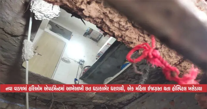 પ્રાપ્ત વિગતો મુજબ નવા વાડજમાં હાઉસીંગ બોર્ડના હરિઓમ એપાર્ટમેન્ટમાં વહેલી સવારે 8-00 કલાકે બ્લોક નં-75 ના એક ફ્લેટમાં અચાનક જ આખે આખી છત ધડાકારભેર એકાએક ધરાશયી બની હતી, જોકે આ સમયે નીચે રહેતા ફ્લેટમાં પરિવારજનો બીજા રૂમમાં હોવાને કારણે મોટી જાનહાની ટળી હતી.પરંતુ ઉપરના માળે રહેતા એક મહિલા નીચે પટકાવાથી ઈજાગ્રસ્ત થતા સારવાર માટે હોસ્પિટલ ખસેડવામાં આવ્યા છે, અહીં તમને જણાવી દઈએ કે નીચેના ફ્લેટમાં રિપેરિંગનું કામ ચાલતું હોવાને કારણે આ દુર્ઘટના સર્જાઈ હોવાનું પણ મનાઈ રહ્યા છે.આ ઘટનાને લઈને હરિઓમ એપાર્ટમેન્ટના રહીશોમાં ગભરાટ ફેલાઈ ગયો હતો.વહેલી સવારે બનેલી ઘટનાને પગલે લોકોના ટોળે ટોળા ઘટના સ્થળ પર દોડી આવ્યા હતા.