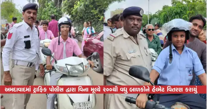 પ્રાપ્ત રિપોર્ટ મુજબ શહેરમાં ટ્રાફિકની સમસ્યાને ધ્યાને લઈને ટ્રાફિક પોલીસ દ્વારા એક જનહિતમાં પ્રશંસનીય કામગીરી કરી છે. શાહીબાગમાં આવેલી અર્થ ઇંગ્લિશ સ્કૂલ પાસેના રસ્તા પર એફ ડિવિઝન ટ્રાફિક પોલીસ દ્વારા વિના મૂલ્યે હેલ્મેટ વિતરણ કરવામાં આવ્યું હતું. જે બાળકો પોતાના માતાપિતા સાથે ટુ વ્હીલર પર સ્કૂલે અવરજવર કરે છે તેવા બાળકોને પોલીસકર્મીઓએ જાતે જ હેલ્મેટ પહેરાવ્યા હતા અને પોલીસકર્મીઓએ બાળકોને હેલ્મેટ પહેરવાનું મહત્વ પણ સમજાવ્યું હતું. અંદાજિત 200થી વધુ બાળકોને હેલ્મેટ વિતરણ કરવામાં આવ્યું હતું.