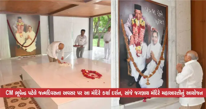 અમદાવાદ : મુખ્યમંત્રી ભુપેન્દ્ર પટેલે આજે પોતાના જન્મ દિવસ અવસરે વહેલી સવારે અડાલજ ત્રિમંદિર ખાતે દાદા ભગવાન મંદિરમાં દર્શન અર્ચન કરીને દિવસના કાર્યોનો પ્રારંભ કર્યો હતો. મુખ્યમંત્રીએ અડાલજમાં ત્રિમંદિર પરિસર માં પૂજ્ય દાદા ભગવાન, પૂજ્ય નીરૂમાંની સમાધિ પર શિશ ઝુકાવી આશીર્વાદ મેળવ્યા હતા અને દેવી દેવતાઓના દર્શન તેમજ શિવ મંદિરમાં જલાભિષેક કર્યો હતો.