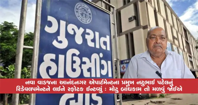 નવા વાડજમાં આનંદનગર એપાર્ટમેન્ટના પ્રમુખ નટુભાઈ પટેલ રિડેવલપમેન્ટને લઈને જણાવે છે કે વર્તમાન પોલીસી અનેક ખામીઓ છે, જેમં રહીશોનું હિત ઓછું અને ડેવલપરો અને હાઉસીંગ બોર્ડના અધિકારીઓનું હિત વધારે હોવાનું જણાવે છે.તેઓ જણાવે છે કે હાલ રિડેવલપમેન્ટની પ્રક્રિયા ચાલે છે જેમાં પોલિસીમાં 40 ટકાનો નિયમ તદ્ન ખોટો છે, આ સિવાય ગુજરાત હાઉસીંગ બોર્ડ ડેવલપરને માઇનસમાં ટેન્ડર આપે છે, મતલબ હાઉસીંગ બોર્ડ ડેવલપરને મકાન બાંધવાના પૈસા આપે છે, આ પૈસાનો બેડફાટ કહેવાય,સરકારને નુકશાન થાય છે જે બિલકુલ વ્યાજબી ના ગણી શકાય, એના કરતા જે કોઈ ડેવલપર રહીશોને 40 ટકા થી વધુ બાંધકામ આપે એવા ડેવલપરને જ કામનો વર્ક ઓર્ડર આપવા માટે ગુજરાત હાઉસીંગ બોર્ડે સહમત થવું જોઈએ અથવા તો એસોસિયેશનને રિડેવલપમેન્ટ કરવાની સત્તા આપવી જોઈએ.