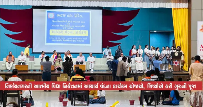 અમદાવાદ : ગુરુપૂર્ણિમાના અવસરે અમદાવાદમાં નિર્ણયનગર ખાતે આવેલ આત્મીય વિદ્યા નિકેતનમાં આચાર્ય વંદના કાર્યક્રમ યોજાયો હતો.IMCTF તથા અમદાવાદ જિલ્લા શિક્ષણ અધિકારી કચેરી ગ્રામ્યના સંયુક્ત ઉપક્રમે આ કાર્યક્રમ યોજાયો હતો. આ કાર્યક્રમમાં ઉપસ્થિત શિષ્યો દ્વારા ગુરુની પૂજા કરવામાં આવી હતી. આ કાર્યક્રમમાં બોર્ડના પૂર્વ ચેરમેન અને શહેરની જાણીતી સ્કૂલોના સંચાલકો હાજર રહ્યા હતા. અમદાવાદ ગ્રામ્યના 1 લાખ જેટલા વિદ્યાર્થીઓ વેબિનારથી આ કાર્યક્રમમાં જોડાયા હતા.
