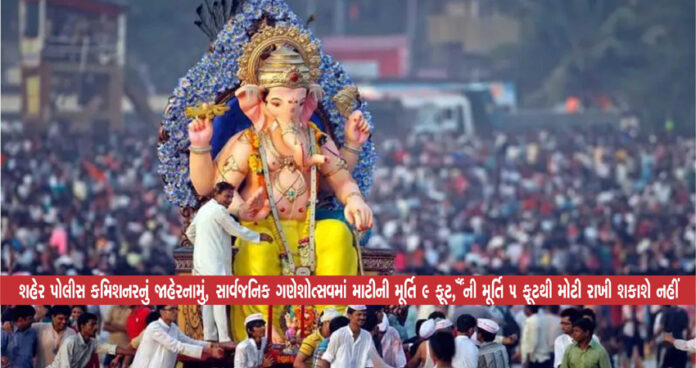 પ્રાપ્ત રિપોર્ટ મુજબ ગણેશ મહોત્સવને લઈને અમદાવાદ શહેર પોલીસ કમિશનરે જાહેરનામું બહાર પાડ્યું છે. ગણેશજીની માટીની મૂર્તિ 9 ફૂટથી ઊંચી નહિ બનાવી શકાય જ્યારે POPથી બનેલી ગણેશજીની મૂર્તિની ઊંચાઈ પાંચ ફૂટની જ હોવી જોઈએ. અમદાવાદ મ્યુનિસિપલ કોર્પોરેશને બનાવેલા કૃત્રિમ કુંડમાં જ ગણેશજીની મૂર્તિનુ વિસર્જન કરવા જણાવાયું છે.