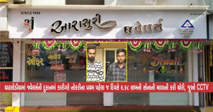 ઘાટલોડીયામાં જ્વેલર્સની દુકાનમાં કારીગરે નોકરીના પ્રથમ પહેલા જ દિવસે 2.68 લાખની સોનાની માળાની કરી ચોરી, જુઓ CCTV