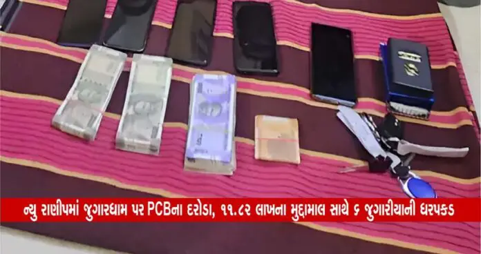 પ્રાપ્ત વિગતો પ્રમાણે અમદાવાદમાં ચાલી રહેલા દારૂ અને જુગારના અડ્ડાઓ બંધ કરાવવા માટે PCB એક્શનમાં આવી ગઈ છે. PCB ની ટીમને ચોક્કસ હકીકતના આધારે બાતમી મળી હતી કે, ન્યુ રાણીપમાં ખોડિયાર માતાજીના મંદિર પાસે રમેશ સથવારા તેના મકાનમાં બહારથી માણસો બોલાવીને જુગારધામ ચલાવી રહ્યો છે. આ બાતમીને આધારે PCB એ તેના ઘરે રેડ પાડી હતી. જેમાં 6 શખસોને જુગાર રમતાં ઝડપી પાડ્યા હતા અને 97,900 રોકડા સહિત કુલ 11.82 લાખનો મુદ્દામાલ કબજે કર્યો હતો.