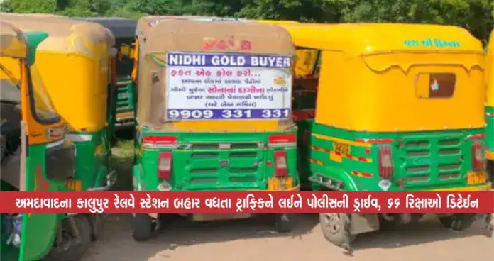 અમદાવાદ : શહેરના કાલુપુર રેલવે સ્ટેશન બહાર છેલ્લા ઘણા સમયથી ખૂબ જ ટ્રાફિક સર્જાઇ રહ્યો છે. આ ટ્રાફિક અંગે ઉચ્ચ અધિકારીઓ સુધી નોંધ લેવામાં આવી છે. ત્યારે ગઈકાલે (18 ઓગસ્ટ) ટ્રાફિક પોલીસ દ્વારા રેલવે સ્ટેશન બહાર રિક્ષાઓ માટેની ખાસ ડ્રાઇવ યોજાઈ હતી. જેમાં અડચણરૂપ પાર્ક કરેલી રિક્ષા અને કેપેસિટી કરતા વધુ પેસેન્જરને બેસાડનાર રિક્ષાચાલકો સામે કાર્યવાહી કરવામાં આવી છે. ટ્રાફિક પોલીસે આઠ કલાકમાં 66 જેટલી રિક્ષા ડિટેઇન કરી છે. હજુ પણ આ કાર્યવાહી ચાલુ જ રહેશે.
