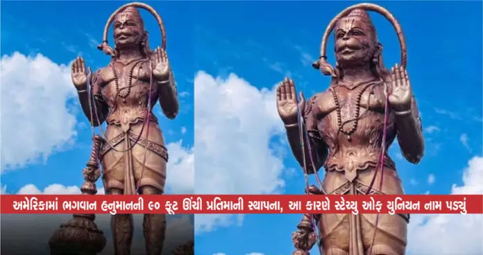 નવી દિલ્હીઃ અમેરિકાના ટેક્સાસ રાજ્યના હ્યુસ્ટનમાં ભગવાન હનુમાનની 90 ફૂટ ઊંચી પ્રતિમાનું અનાવરણ કરવામાં આવ્યું હતું. આ અમેરિકાની ત્રીજી સૌથી ઊંચી પ્રતિમા હોવાનું કહેવાય છે. આ પ્રતિમાને ‘સ્ટેચ્યુ ઓફ યુનિયન’ નામ આપવામાં આવ્યું છે. આ પ્રતિમાને ટેક્સાસના સુગર લેન્ડ વિસ્તારમાં સ્થિત શ્રી અષ્ટલક્ષ્મી મંદિરના પરિસરમાં સ્થાપિત કરવામાં આવી છે.