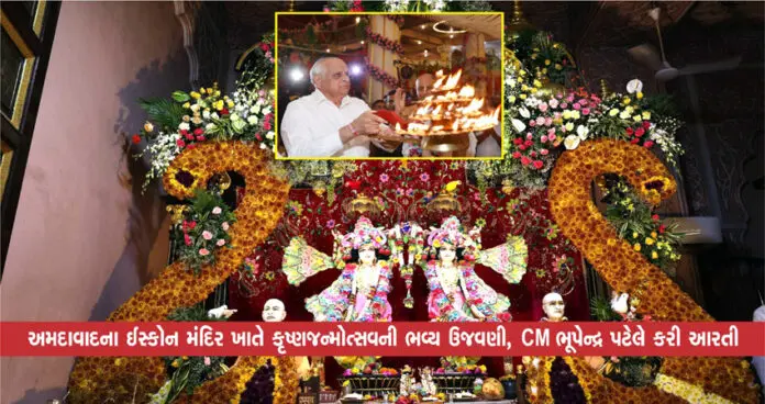 અમદાવાદ : એસજી હાઈવે સ્થિત ઇસ્કોન મંદિરમાં દર વર્ષેની જેમ આ વર્ષે પણ જન્માષ્ટમીના તહેવાર ભવ્ય ઉજવણી કરવામાં આવી. ભારે વરસાદી માહોલ વચ્ચે પણ ખૂબ મોટી સંખ્યામાં ભક્તો મંદિર પ્રાંગણમાં ઉમટી પડ્યા હતા. ગુજરાતના મુખ્યમંત્રી ભૂપેન્દ્ર પટેલ પણ કૃષ્ણજન્મોત્સવની ઉજવણીમાં ઇસ્કોન મંદિર ખાતે પહોંચ્યા હતા અને ભગવાન શ્રીકૃષ્ણની આરતી કરી હતી.