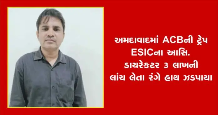 આજે અમદાવાદ આશ્રમ રોડ ખાતે આવેલી કર્મચારી રાજ્ય વીમા નિગમ કચેરીના પ્રથમ માળે ACBએ ટ્રેપ ગોઠવી હતી. કમલકાંત મીણાએ રૂપિયા 3 લાખની લાંચ સ્વીકારતા ACB ટીમે તેમને ઝડપી લઇ લાંચની રકમ કબજે કરી હતી.ACB અમદાવાદના પીઆઈ એ. કે. ચૌહાણ અને તેમની ટીમે ટ્રેપ ગોઠવી હતી. જ્યારે પીઆઈ એન. બી. સોલંકી તેમની મદદમાં હતા. સુપરવિઝન અધિકારી તરીકે મદદનીશ નિયામક જી.વી.પઢેરીયા રહ્યાં હતાં.